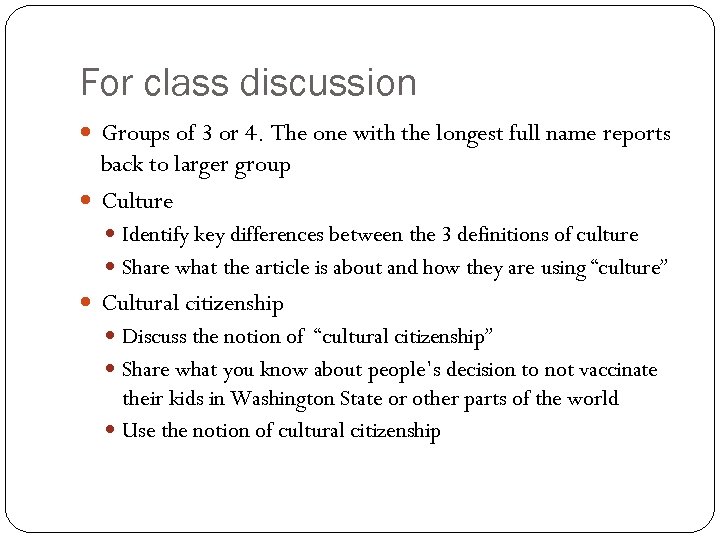 For class discussion Groups of 3 or 4. The one with the longest full name reports back to larger group Culture Identify key differences between the 3 definitions of culture Share what the article is about and how they are using “culture” Cultural citizenship Discuss the notion of “cultural citizenship” Share what you know about people’s decision to not vaccinate their kids in Washington State or other parts of the world Use the notion of cultural citizenship
