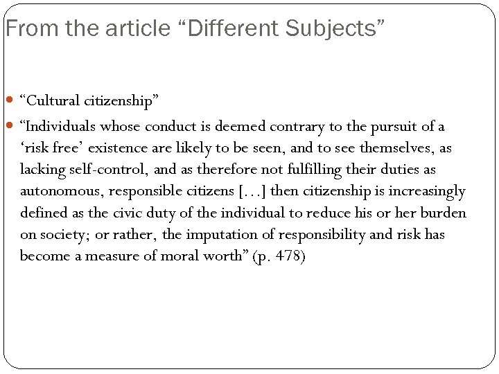 From the article “Different Subjects” “Cultural citizenship” “Individuals whose conduct is deemed contrary to the pursuit of a ‘risk free’ existence are likely to be seen, and to see themselves, as lacking self-control, and as therefore not fulfilling their duties as autonomous, responsible citizens […] then citizenship is increasingly defined as the civic duty of the individual to reduce his or her burden on society; or rather, the imputation of responsibility and risk has become a measure of moral worth” (p. 478)