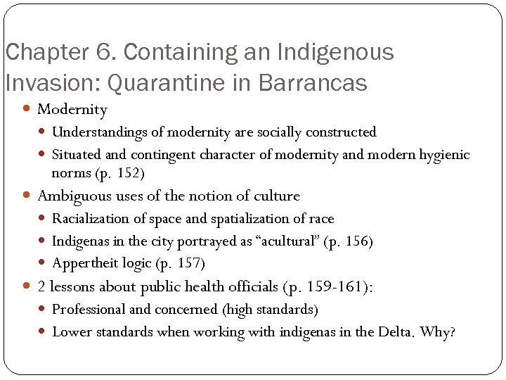 Chapter 6. Containing an Indigenous Invasion: Quarantine in Barrancas Modernity Understandings of modernity are socially constructed Situated and contingent character of modernity and modern hygienic norms (p. 152) Ambiguous uses of the notion of culture Racialization of space and spatialization of race Indigenas in the city portrayed as “acultural” (p. 156) Appertheit logic (p. 157) 2 lessons about public health officials (p. 159 -161): Professional and concerned (high standards) Lower standards when working with indigenas in the Delta. Why?