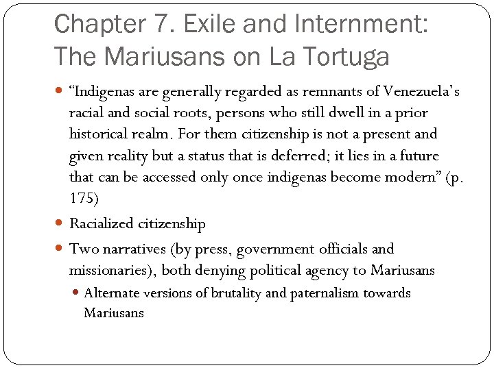 Chapter 7. Exile and Internment: The Mariusans on La Tortuga “Indigenas are generally regarded as remnants of Venezuela’s racial and social roots, persons who still dwell in a prior historical realm. For them citizenship is not a present and given reality but a status that is deferred; it lies in a future that can be accessed only once indigenas become modern” (p. 175) Racialized citizenship Two narratives (by press, government officials and missionaries), both denying political agency to Mariusans Alternate versions of brutality and paternalism towards Mariusans