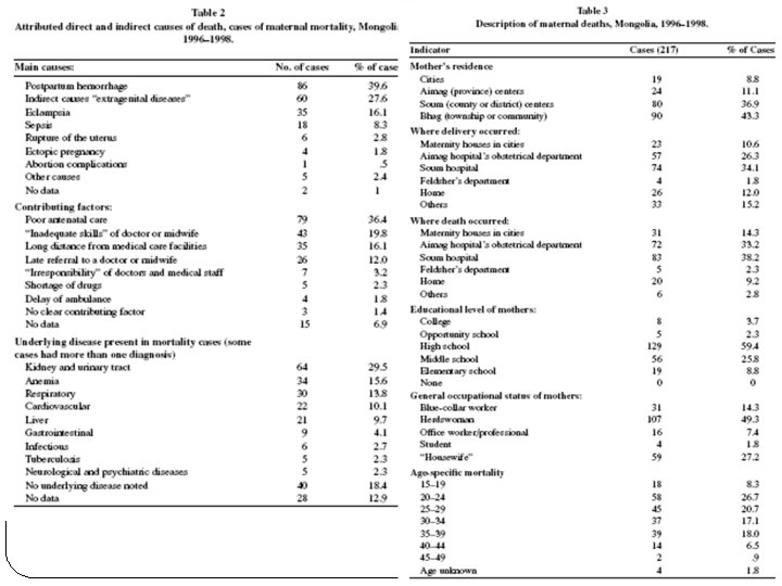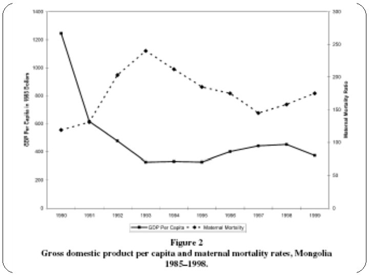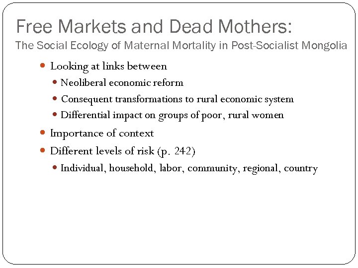 Free Markets and Dead Mothers: The Social Ecology of Maternal Mortality in Post-Socialist Mongolia Looking at links between Neoliberal economic reform Consequent transformations to rural economic system Differential impact on groups of poor, rural women Importance of context Different levels of risk (p. 242) Individual, household, labor, community, regional, country