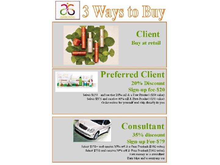 So, before I share with you how to get these products at a discount, I want to share with you the BEST thing about Arbonne…the business opportunity! Every time I do an Arbonne event, someone always comes to me afterwards and asks about becoming a consultant! So, that’s why I am going to share the benefits quickly. • You do not have to know a ton of people, be a salesperson or have a lot of free time! • You can start your Arbonne business alongside your full-time job and weave it in by just helping your friends and family live a healthier lifestyle! • Work from home, part-time! • Incredible income potential-You can earn $500 extra a month or earn a 6 -figure income • DM earns $200 -$1200 a month, AM earns $1000 -$3500, RVP earns $3500 -$10, 000 and the average NVP earns about $180 k A YEAR. • Great tax deductions-Look at the products on our table. I use these in my home, show and sample them to others and get to write them off as a tax deduction • Great training and teamwork approach • No geographical territories (US, Canada, Australia, UK…Poland 2014, Taiwan 2015 • Mercedes Benz Reward • Earn trips, Great products & discounts • (Share your upline’s success story!) • Any questions? If you’re interested, I have a packet here that I would love to send home with you so you can learn more!