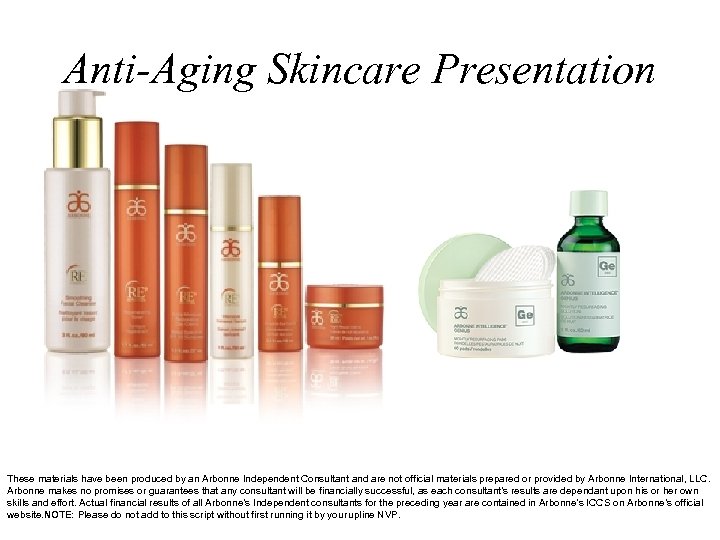 Anti-Aging Skincare Presentation These materials have been produced by an Arbonne Independent Consultant and are not official materials prepared or provided by Arbonne International, LLC. Arbonne makes no promises or guarantees that any consultant will be financially successful, as each consultant’s results are dependant upon his or her own skills and effort. Actual financial results of all Arbonne’s Independent consultants for the preceding year are contained in Arbonne’s ICCS on Arbonne’s official website. NOTE: Please do not add to this script without first running it by your upline NVP.