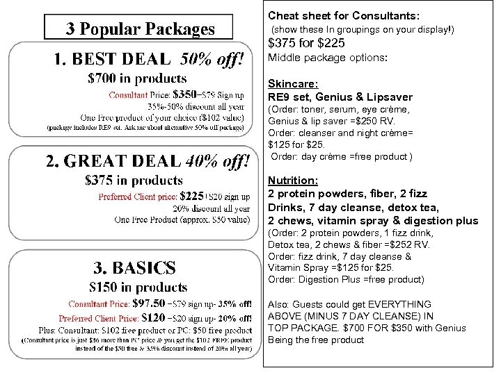 Cheat sheet for Consultants: (show these In groupings on your display!) $375 for $225 Middle package options: Skincare: RE 9 set, Genius & Lipsaver (Order: toner, serum, eye crème, Genius & lip saver =$250 RV. Order: cleanser and night crème= $125 for $25. Order: day crème =free product ) Nutrition: 2 protein powders, fiber, 2 fizz Drinks, 7 day cleanse, detox tea, 2 chews, vitamin spray & digestion plus (Order: 2 protein powders, 1 fizz drink, Detox tea, 2 chews & fiber =$252 RV. Order: fizz drink, 7 day cleanse & Vitamin Spray =$125 for $25. Order: Digestion Plus =free product) Also: Guests could get EVERYTHING ABOVE (MINUS 7 DAY CLEANSE) IN TOP PACKAGE. $700 FOR $350 with Genius Being the free product