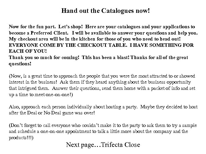 Hand out the Catalogues now! Now for the fun part. Let’s shop! Here are your catalogues and your applications to become a Preferred Client. I will be available to answer your questions and help you. My checkout area will be in the kitchen for those of you who need to head out! EVERYONE COME BY THE CHECKOUT TABLE. I HAVE SOMETHING FOR EACH OF YOU! Thank you so much for coming! This has been a blast! Thanks for all of the great questions! (Now, is a great time to approach the people that you were the most attracted to or showed interest in the business! Ask them if they heard anything about the business opportunity that intrigued them. Answer their questions, send them home with a packet of info and set up a time to meet one-on-one!) Also, approach each person individually about hosting a party. Maybe they decided to host after the Deal or No Deal game was over! (Don’t forget to call everyone who couldn’t make it to the party to ask them to try a sample and schedule a one-on-one appointment to talk a little more about the company and the products!!!) Next page…Trifecta Close