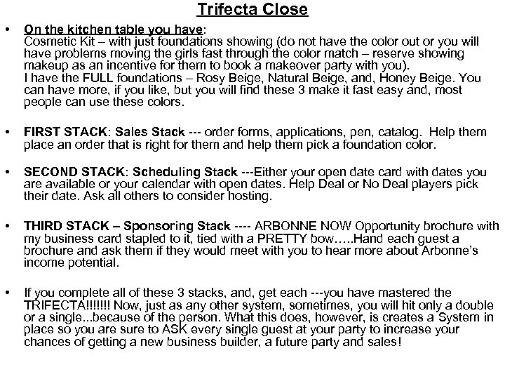 Trifecta Close • On the kitchen table you have: Cosmetic Kit – with just foundations showing (do not have the color out or you will have problems moving the girls fast through the color match – reserve showing makeup as an incentive for them to book a makeover party with you). I have the FULL foundations – Rosy Beige, Natural Beige, and, Honey Beige. You can have more, if you like, but you will find these 3 make it fast easy and, most people can use these colors. • FIRST STACK: Sales Stack --- order forms, applications, pen, catalog. Help them place an order that is right for them and help them pick a foundation color. • SECOND STACK: Scheduling Stack ---Either your open date card with dates you are available or your calendar with open dates. Help Deal or No Deal players pick their date. Ask all others to consider hosting. • THIRD STACK – Sponsoring Stack ---- ARBONNE NOW Opportunity brochure with my business card stapled to it, tied with a PRETTY bow…. . Hand each guest a brochure and ask them if they would meet with you to hear more about Arbonne’s income potential. • If you complete all of these 3 stacks, and, get each ---you have mastered the TRIFECTA!!!!!!! Now, just as any other system, sometimes, you will hit only a double or a single. . . because of the person. What this does, however, is creates a System in place so you are sure to ASK every single guest at your party to increase your chances of getting a new business builder, a future party and sales!