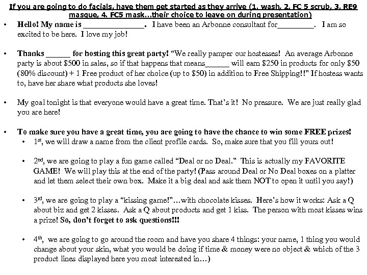 If you are going to do facials, have them get started as they arrive (1. wash, 2. FC 5 scrub, 3. RE 9 masque, 4. FC 5 mask…their choice to leave on during presentation) • Hello! My name is ________. I have been an Arbonne consultant for_____. I am so excited to be here. I love my job! • Thanks ______ for hosting this great party! “We really pamper our hostesses! An average Arbonne party is about $500 in sales, so if that happens that means______ will earn $250 in products for only $50 (80% discount) + 1 Free product of her choice (up to $50) in addition to Free Shipping!!” If hostess wants to, have her share what products she loves! • My goal tonight is that everyone would have a great time. That’s it! No pressure. We are just really glad you are here! • To make sure you have a great time, you are going to have the chance to win some FREE prizes! • 1 st, we will draw a name from the client profile cards. So, make sure that you fill yours out! • 2 nd, we are going to play a fun game called “Deal or no Deal. ” This is actually my FAVORITE GAME! We will play this at the end of the party! (Pass around Deal or No Deal boxes on a platter and let them select their own box. Make it a big deal and ask them NOT to open it until you say!) • 3 rd, we are going to play a “kissing game!”…with chocolate kisses. Here’s how it works: Ask a Q about biz and get 2 kisses. Ask a Q about products and get 1 kiss. The person with most kisses wins a prize! So, don’t forget to ask questions!!! • 4 th, we are going to go around the room and have you share 4 things: your name, 1 thing you would change about your skin, what you would be doing if time & money were no object & which of the 3 product lines displayed here you most interested in…)