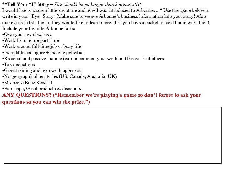 **Tell Your “I” Story – This should be no longer than 2 minutes!!!! I would like to share a little about me and how I was introduced to Arbonne… “ Use the space below to write in your “Eye” Story. Make sure to weave Arbonne’s business information into your story! Also make sure to tell them if they would like to learn more, that you have a packet to send home with them! Include your favorite Arbonne facts: • Own your own business • Work from home-part-time • Work around full-time job or busy life • Incredible six-figure + income potential • Residual and passive income (earn income on your work and the work of others • Tax deductions • Great training and teamwork approach • No geographical territories (US, Canada, Australia, UK) • Mercedes Benz Reward • Earn trips, Great products & discounts ANY QUESTIONS? (“Remember we’re playing a game so don’t forget to ask your questions so you can win the prize. ”)