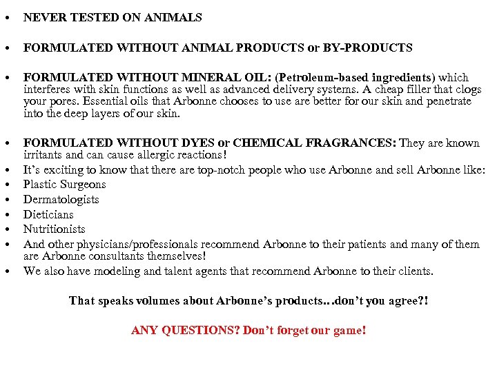 • NEVER TESTED ON ANIMALS • FORMULATED WITHOUT ANIMAL PRODUCTS or BY-PRODUCTS • FORMULATED WITHOUT MINERAL OIL: (Petroleum-based ingredients) which interferes with skin functions as well as advanced delivery systems. A cheap filler that clogs your pores. Essential oils that Arbonne chooses to use are better for our skin and penetrate into the deep layers of our skin. • FORMULATED WITHOUT DYES or CHEMICAL FRAGRANCES: They are known irritants and can cause allergic reactions! It’s exciting to know that there are top-notch people who use Arbonne and sell Arbonne like: Plastic Surgeons Dermatologists Dieticians Nutritionists And other physicians/professionals recommend Arbonne to their patients and many of them are Arbonne consultants themselves! We also have modeling and talent agents that recommend Arbonne to their clients. • • That speaks volumes about Arbonne’s products…don’t you agree? ! ANY QUESTIONS? Don’t forget our game!