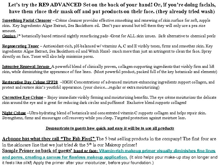 Let’s try the RE 9 ADVANCED Set on the back of your hand! Or, if you’re doing facials, have them rince their mask off and put products on their face. (they already tried wash) Smoothing Facial Cleanser – Crème cleanser provides effective smoothing and renewing of skin surface for soft, supple skin. Key Ingredients: Algae Extract, Sea Buckthorn oil. Don’t pass around but tell them they will only use a pea size amount. Genius-1 st botanically based retinoid nightly resurfacing pads- Great for ALL skin issues. Safe alternative to chemical peels Regenerating Toner – Antioxidant-rich, p. H-balanced w/ vitamins A, C and E visibly tones, firms and smoothes skin. Key ingredients: Algae Extract, Sea Buckthorn oil and Witch Hazel- much more than just an astringent to clean the face. Spray directly on face. Toner will also help minimize pores. Intensive Renewal Serum- A powerful blend of clinically proven, collagen-supporting ingredients that visibly firm and lift skin, while diminishing the appearance of fine lines. (Most powerful product, packed full of the key botanicals and elements) Restorative Day Crème SPF 20 –HIGH Concentrations of advanced moisture-enhancing ingredients support collagen, and protect and restore skin’s youthful appearance. (your choice…regular or extra moisturizing) Corrective Eye Crème – Enjoy immediate visibly firming and moisturizing benefits. The eye crème moisturizes the delicate skin around the eye and is great for reducing dark circles and puffiness! Exclusive blend supports collagen! Night Crème –Ultra-hydrating blend of botanicals and concentrated vitamin C supports collagen and helps repair skin. Strengthens, firms and encourages cell recovery while you sleep. Targeted protection against moisture loss. Demonstrate to guests how quick and easy it will be to use all products Arbonne has what they call “The Fab Five!” The 5 best selling products in the company! The first four are in the skincare line that we just tried & the 5 th is our Makeup primer! Sample Primer on back of guests’ hand or face: Vitamin-rich makeup primer visually diminishes fine lines and pores, creating a canvas for flawless makeup application. (It also helps your make-up stay on longer and it feels like silk!) Apply the primer after your moisturizer, before your foundation. )