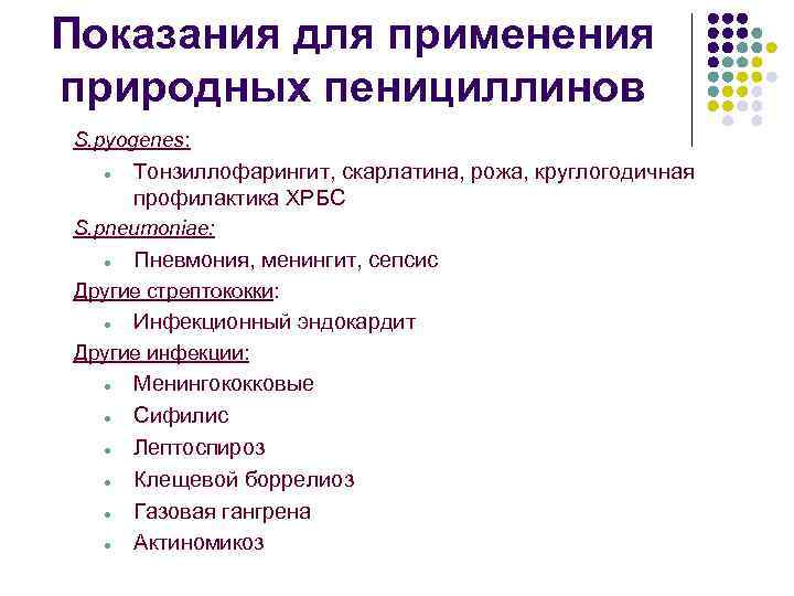 Показания для применения природных пенициллинов S. pyogenes: · Тонзиллофарингит, скарлатина, рожа, круглогодичная профилактика ХРБС S. pneumoniae: · Пневмония, менингит, сепсис Другие стрептококки: · Инфекционный эндокардит Другие инфекции: · · · Менингококковые Сифилис Лептоспироз Клещевой боррелиоз Газовая гангрена Актиномикоз