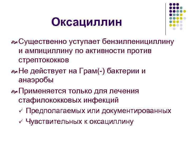 Оксациллин Существенно уступает бензилпенициллину и ампициллину по активности против стрептококков Не действует на Грам(-) бактерии и анаэробы Применяется только для лечения стафилококковых инфекций ü Предполагаемых или документированных ü Чувствительных к оксациллину