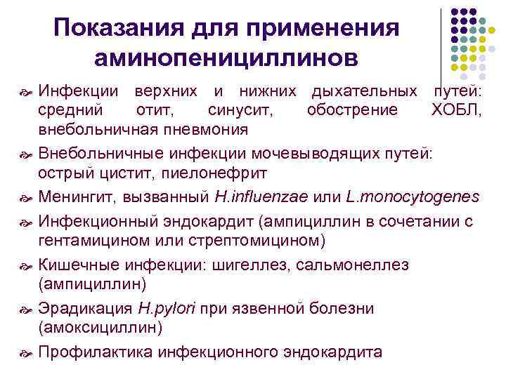Показания для применения аминопенициллинов Инфекции верхних и нижних дыхательных путей: средний отит, синусит, обострение ХОБЛ, внебольничная пневмония Внебольничные инфекции мочевыводящих путей: острый цистит, пиелонефрит Менингит, вызванный H. influenzae или L. monocytogenes Инфекционный эндокардит (ампициллин в сочетании с гентамицином или стрептомицином) Кишечные инфекции: шигеллез, сальмонеллез (ампициллин) Эрадикация H. pylori при язвенной болезни (амоксициллин) Профилактика инфекционного эндокардита