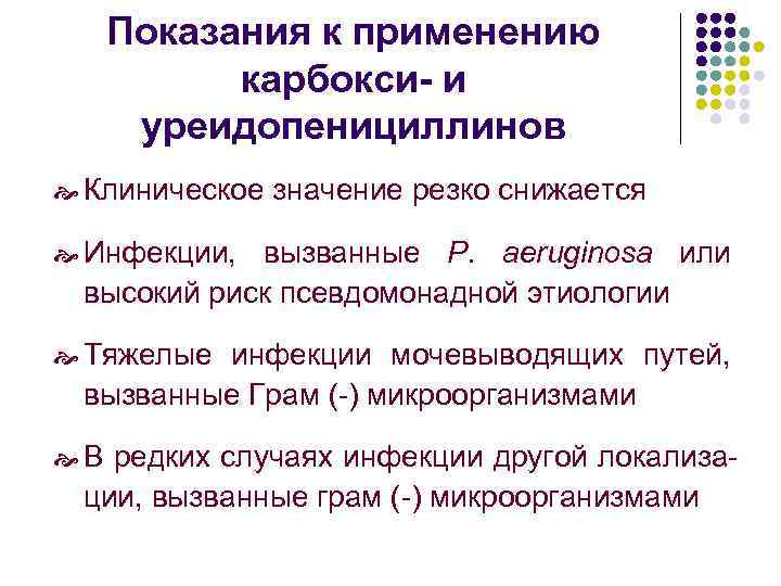 Показания к применению карбокси- и уреидопенициллинов Клиническое значение резко снижается Инфекции, вызванные P. aeruginosa или высокий риск псевдомонадной этиологии Тяжелые инфекции мочевыводящих путей, вызванные Грам (-) микроорганизмами В редких случаях инфекции другой локализации, вызванные грам (-) микроорганизмами