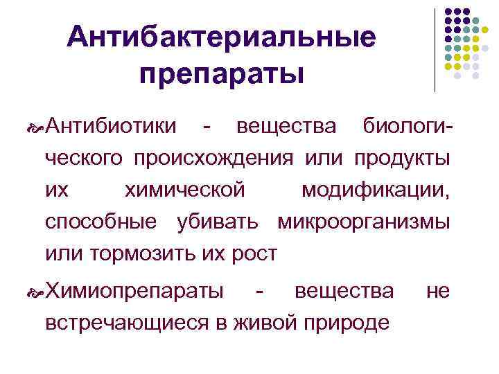 Антибактериальные препараты Антибиотики - вещества биологического происхождения или продукты их химической модификации, способные убивать микроорганизмы или тормозить их рост Химиопрепараты - вещества встречающиеся в живой природе не