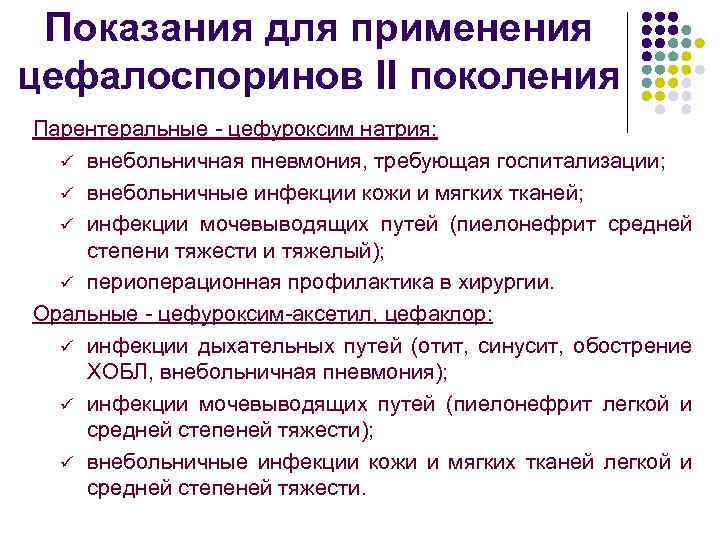 Показания для применения цефалоспоринов II поколения Парентеральные - цефуроксим натрия: ü внебольничная пневмония, требующая госпитализации; ü внебольничные инфекции кожи и мягких тканей; ü инфекции мочевыводящих путей (пиелонефрит средней степени тяжести и тяжелый); ü периоперационная профилактика в хирургии. Оральные - цефуроксим-аксетил, цефаклор: ü инфекции дыхательных путей (отит, синусит, обострение ХОБЛ, внебольничная пневмония); ü инфекции мочевыводящих путей (пиелонефрит легкой и средней степеней тяжести); ü внебольничные инфекции кожи и мягких тканей легкой и средней степеней тяжести.