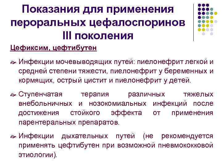 Показания для применения пероральных цефалоспоринов III поколения Цефиксим, цефтибутен Инфекции мочевыводящих путей: пиелонефрит легкой и средней степени тяжести, пиелонефрит у беременных и кормящих, острый цистит и пиелонефрит у детей. Ступенчатая терапия различных тяжелых внебольничных и нозокомиальных инфекций после достижения стойкого эффекта от применения парентеральных препаратов. Инфекции дыхательных путей (не рекомендуется применять цефтибутен при возможной пневмококковой этиологии).