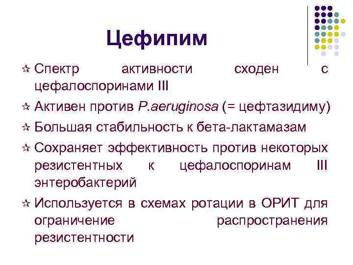 Цефипим ¶ Спектр активности цефалоспоринами III ¶ Активен сходен с против P. aeruginosa (= цефтазидиму) ¶ Большая стабильность к бета-лактамазам ¶ Сохраняет эффективность против некоторых резистентных к цефалоспоринам III энтеробактерий ¶ Используется в схемах ротации в ОРИТ для ограничение распространения резистентности