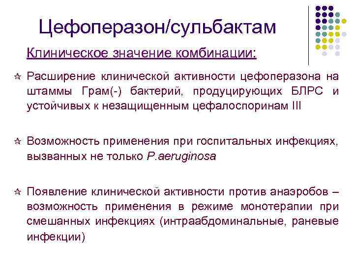 Цефоперазон/сульбактам Клиническое значение комбинации: ¶ Расширение клинической активности цефоперазона на штаммы Грам(-) бактерий, продуцирующих БЛРС и устойчивых к незащищенным цефалоспоринам III ¶ Возможность применения при госпитальных инфекциях, вызванных не только P. aeruginosa ¶ Появление клинической активности против анаэробов – возможность применения в режиме монотерапии при смешанных инфекциях (интраабдоминальные, раневые инфекции)
