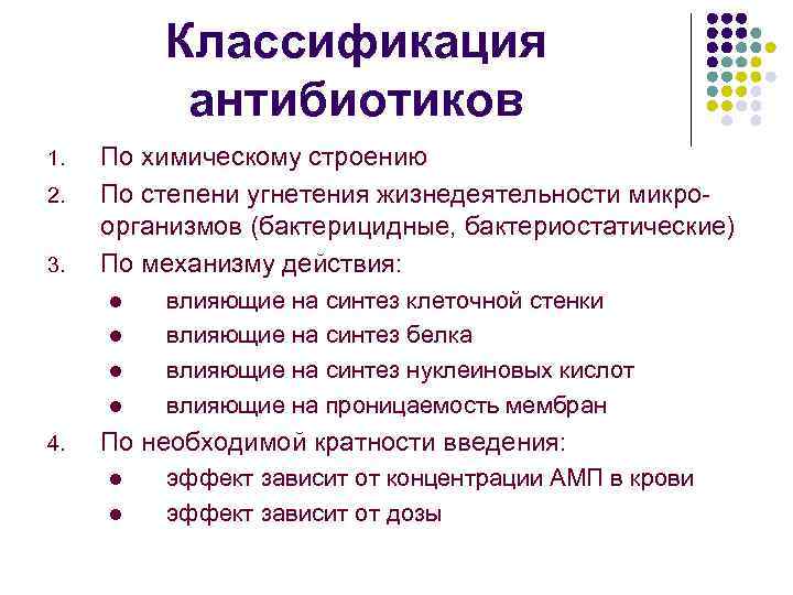 Классификация антибиотиков 1. 2. 3. По химическому строению По степени угнетения жизнедеятельности микроорганизмов (бактерицидные, бактериостатические) По механизму действия: l l 4. влияющие на синтез клеточной стенки влияющие на синтез белка влияющие на синтез нуклеиновых кислот влияющие на проницаемость мембран По необходимой кратности введения: l l эффект зависит от концентрации АМП в крови эффект зависит от дозы