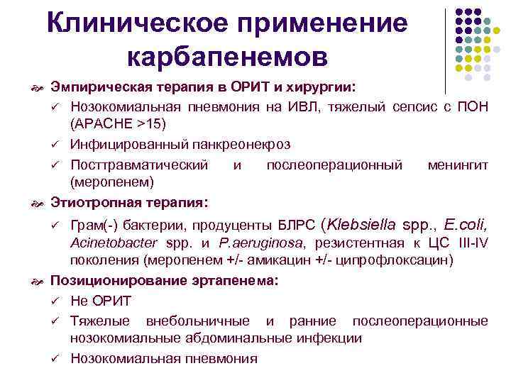 Клиническое применение карбапенемов Эмпирическая терапия в ОРИТ и хирургии: Нозокомиальная пневмония на ИВЛ, тяжелый сепсис с ПОН (APACHE >15) ü Инфицированный панкреонекроз ü Посттравматический и послеоперационный менингит (меропенем) Этиотропная терапия: ü Грам(-) бактерии, продуценты БЛРС (Klebsiella spp. , E. coli, Acinetobacter spp. и P. aeruginosa, резистентная к ЦС III-IV поколения (меропенем +/- амикацин +/- ципрофлоксацин) Позиционирование эртапенема: ü Не ОРИТ ü Тяжелые внебольничные и ранние послеоперационные нозокомиальные абдоминальные инфекции ü Нозокомиальная пневмония ü
