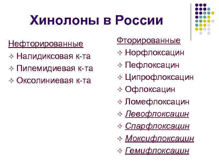 Хинолоны в России Нефторированные ² Налидиксовая к-та ² Пипемидиевая к-та ² Оксолиниевая к-та Фторированные ² Норфлоксацин ² Пефлоксацин ² Ципрофлоксацин ² Офлоксацин ² Ломефлоксацин ² Левофлоксацин ² Спарфлоксацин ² Моксифлоксацин ² Гемифлоксацин