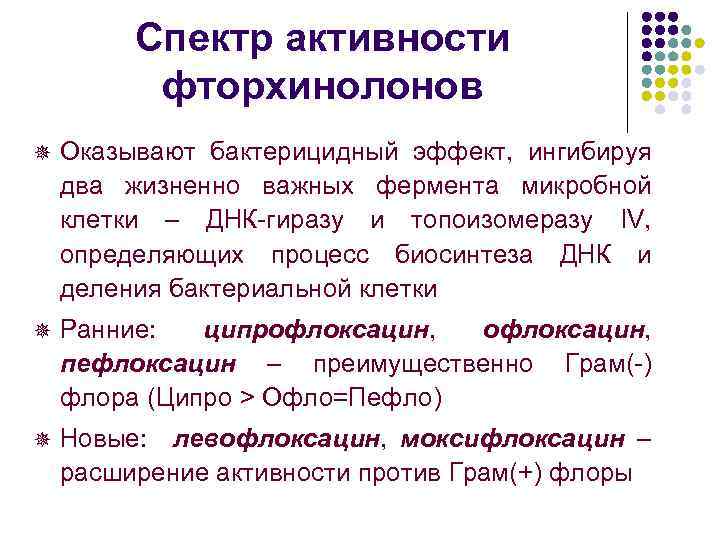Спектр активности фторхинолонов ¯ Оказывают бактерицидный эффект, ингибируя два жизненно важных фермента микробной клетки – ДНК-гиразу и топоизомеразу IV, определяющих процесс биосинтеза ДНК и деления бактериальной клетки ¯ Ранние: ципрофлоксацин, пефлоксацин – преимущественно Грам(-) флора (Ципро > Офло=Пефло) ¯ Новые: левофлоксацин, моксифлоксацин – расширение активности против Грам(+) флоры
