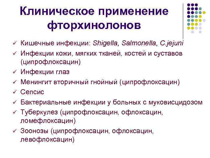 Клиническое применение фторхинолонов ü ü ü ü Кишечные инфекции: Shigella, Salmonella, C. jejuni Инфекции кожи, мягких тканей, костей и суставов (ципрофлоксацин) Инфекции глаз Менингит вторичный гнойный (ципрофлоксацин) Сепсис Бактериальные инфекции у больных с муковисцидозом Туберкулез (ципрофлоксацин, ломефлоксацин) Зоонозы (ципрофлоксацин, левофлоксацин)