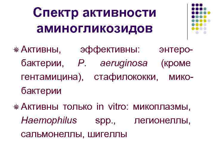 Спектр активности аминогликозидов ¯ Активны, эффективны: энтеробактерии, P. aeruginosa (кроме гентамицина), стафилококки, микобактерии ¯ Активны только in vitro: микоплазмы, Haemophilus spp. , легионеллы, сальмонеллы, шигеллы
