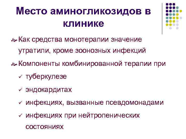 Место аминогликозидов в клинике Как средства монотерапии значение утратили, кроме зоонозных инфекций Компоненты комбинированной терапии при ü туберкулезе ü эндокардитах ü инфекциях, вызванные псевдомонадами ü инфекциях при нейтропенических состояниях