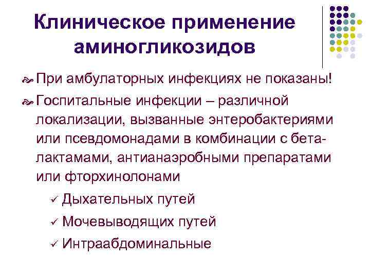 Клиническое применение аминогликозидов При амбулаторных инфекциях не показаны! Госпитальные инфекции – различной локализации, вызванные энтеробактериями или псевдомонадами в комбинации с беталактамами, антианаэробными препаратами или фторхинолонами ü Дыхательных путей ü Мочевыводящих путей ü Интраабдоминальные
