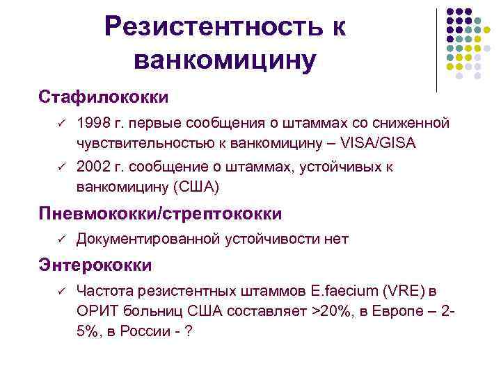Резистентность к ванкомицину Стафилококки ü 1998 г. первые сообщения о штаммах со сниженной чувствительностью к ванкомицину – VISA/GISA ü 2002 г. сообщение о штаммах, устойчивых к ванкомицину (США) Пневмококки/стрептококки ü Документированной устойчивости нет Энтерококки ü Частота резистентных штаммов E. faecium (VRE) в ОРИТ больниц США составляет >20%, в Европе – 25%, в России - ?