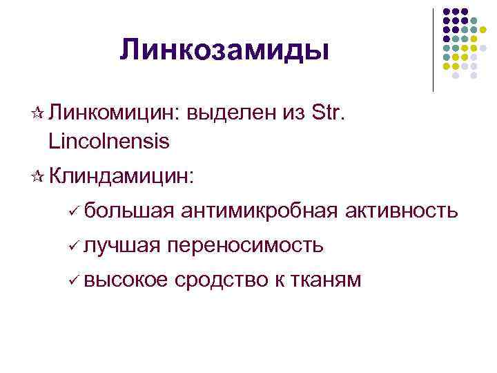 Линкозамиды ¶ Линкомицин: выделен из Str. Lincolnensis ¶ Клиндамицин: ü большая ü лучшая антимикробная активность переносимость ü высокое сродство к тканям