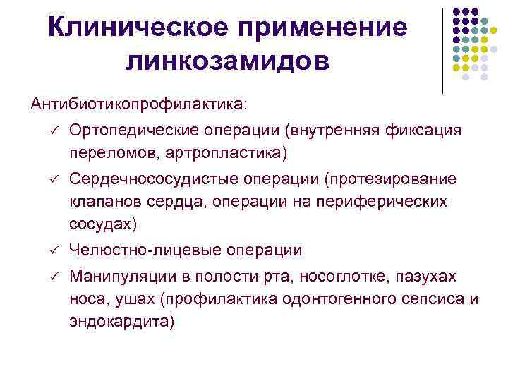 Клиническое применение линкозамидов Антибиотикопрофилактика: ü Ортопедические операции (внутренняя фиксация переломов, артропластика) ü Сердечнососудистые операции (протезирование клапанов сердца, операции на периферических сосудах) ü Челюстно-лицевые операции ü Манипуляции в полости рта, носоглотке, пазухах носа, ушах (профилактика одонтогенного сепсиса и эндокардита)