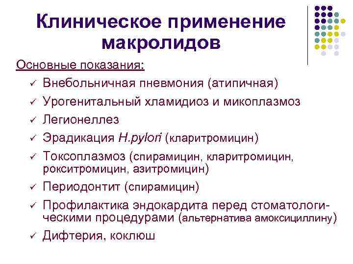 Клиническое применение макролидов Основные показания: ü Внебольничная пневмония (атипичная) ü Урогенитальный хламидиоз и микоплазмоз ü Легионеллез ü Эрадикация H. pylori (кларитромицин) ü Токсоплазмоз (спирамицин, кларитромицин, рокситромицин, азитромицин) ü Периодонтит (спирамицин) ü Профилактика эндокардита перед стоматологическими процедурами (альтернатива амоксициллину) ü Дифтерия, коклюш
