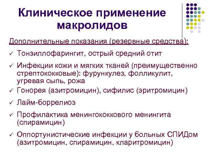 Клиническое применение макролидов Дополнительные показания (резервные средства): ü Тонзиллофарингит, острый средний отит ü ü Инфекции кожи и мягких тканей (преимущественно стрептококковые): фурункулез, фолликулит, угревая сыпь, рожа Гонорея (азитромицин), сифилис (эритромицин) ü Лайм-боррелиоз ü Профилактика менингококкового менингита (спирамицин) ü Оппортунистические инфекции у больных СПИДом (азитромицин, спирамицин, кларитромицин)