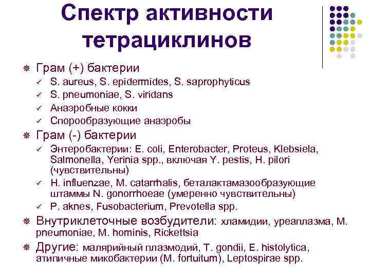 Спектр активности тетрациклинов ¯ Грам (+) бактерии ü ü ¯ S. aureus, S. epidermides, S. saprophyticus S. pneumoniae, S. viridans Анаэробные кокки Спорообразующие анаэробы Грам (-) бактерии Энтеробактерии: E. coli, Enterobacter, Proteus, Klebsiela, Salmonella, Yerinia spp. , включая Y. pestis, H. pilori (чувствительны) ü H. influenzae, M. catarrhalis, беталактамазообразующие штаммы N. gonorrhoeae (умеренно чувствительны) ü P. aknes, Fusobacterium, Prevotella spp. ¯ Внутриклеточные возбудители: хламидии, уреаплазма, M. pneumoniae, M. hominis, Rickettsia ¯ Другие: малярийный плазмодий, T. gondii, E. histolytica, атипичные микобактерии (M. fortuitum), Leptospirae spp. ü