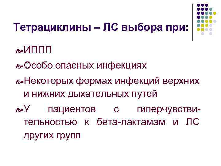 Тетрациклины – ЛС выбора при: ИППП Особо опасных инфекциях Некоторых формах инфекций верхних и нижних дыхательных путей У пациентов с гиперчувствительностью к бета-лактамам и ЛС других групп