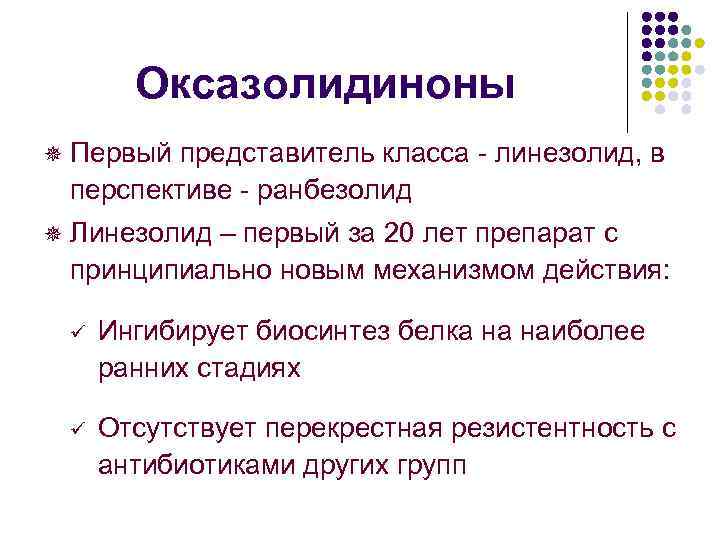Оксазолидиноны ¯ Первый представитель класса - линезолид, в перспективе - ранбезолид ¯ Линезолид – первый за 20 лет препарат с принципиально новым механизмом действия: ü Ингибирует биосинтез белка на наиболее ранних стадиях ü Отсутствует перекрестная резистентность с антибиотиками других групп