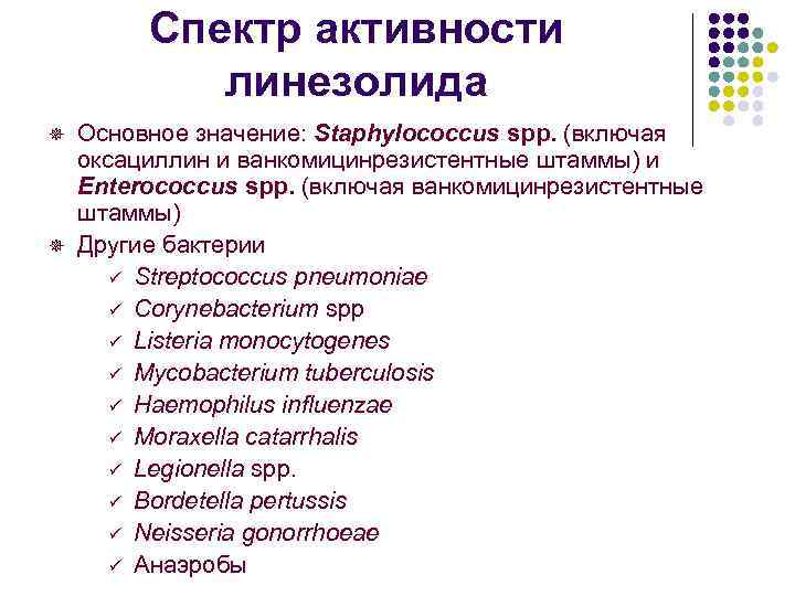 Спектр активности линезолида Основное значение: Staphylococcus spp. (включая оксациллин и ванкомицинрезистентные штаммы) и Enterococcus spp. (включая ванкомицинрезистентные штаммы) ¯ Другие бактерии ü Streptococcus pneumoniae ü Corynebacterium spp ü Listeria monocytogenes ü Mycobacterium tuberculosis ü Haemophilus influenzae ü Moraxella catarrhalis ü Legionella spp. ü Bordetella pertussis ü Neisseria gonorrhoeae ü Анаэробы ¯
