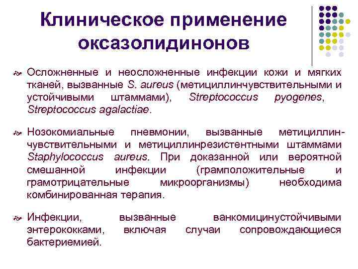 Клиническое применение оксазолидинонов Осложненные и неосложненные инфекции кожи и мягких тканей, вызванные S. aureus (метициллинчувствительными и устойчивыми штаммами), Streptococcus pyogenes, Streptococcus agalactiae. Нозокомиальные пневмонии, вызванные метициллинчувствительными и метициллинрезистентными штаммами Staphylococcus aureus. При доказанной или вероятной смешанной инфекции (грамположительные и грамотрицательные микроорганизмы) необходима комбинированная терапия. Инфекции, энтерококками, бактериемией. вызванные ванкомицинустойчивыми включая случаи сопровождающиеся