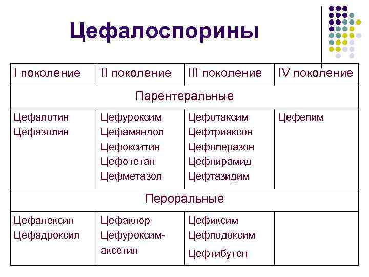 Цефалоспорины I поколение III поколение IV поколение Парентеральные Цефалотин Цефазолин Цефуроксим Цефамандол Цефокситин Цефотетан Цефметазол Цефотаксим Цефтриаксон Цефоперазон Цефпирамид Цефтазидим Пероральные Цефалексин Цефадроксил Цефаклор Цефуроксимаксетил Цефиксим Цефподоксим Цефтибутен Цефепим