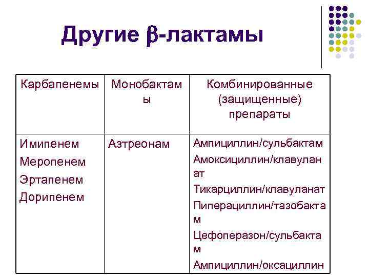 Другие -лактамы Карбапенемы Монобактам ы Имипенем Меропенем Эртапенем Дорипенем Азтреонам Комбинированные (защищенные) препараты Ампициллин/сульбактам Амоксициллин/клавулан ат Тикарциллин/клавуланат Пиперациллин/тазобакта м Цефоперазон/сульбакта м Ампициллин/оксациллин