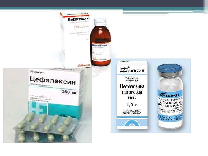 Цефалоспорины: • 1 поколение: Цефазолин (Кефзол) • 2 поколение: Цефуроксим натрия (Зинацеф) • • 3 поколение: Цефотаксим (Клафоран), Цефтриаксон (Лонгацеф) • 4 поколение: Цефепим (Максипим)