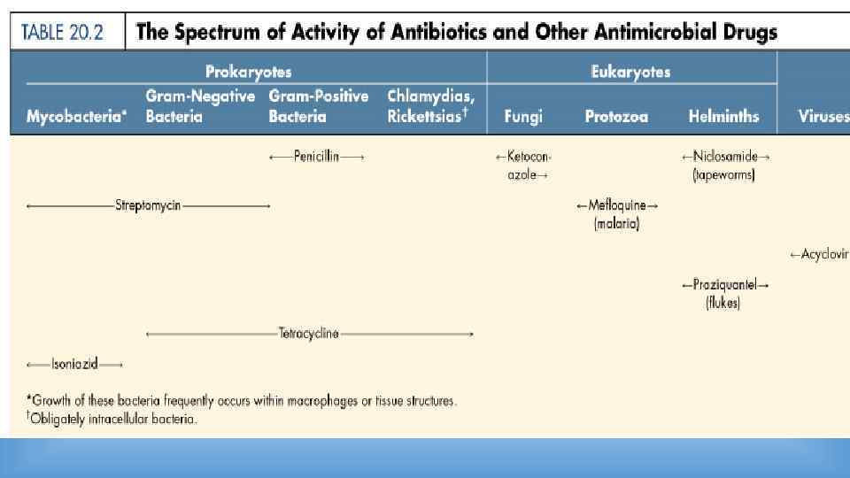 Классификация антимикробных препаратов • По типу действия - бактериостатические - бактерицидные, в т. ч. бактериолитические (лизирующие клетку) • По спектру действия * широкого (действуют на широкий круг микробов) * узкого (действуют только на Гр+ микрофлору …) - антибактериальные -- противотуберкулезные - противовирусные - противогрибковые - противопротозойные, противогельминтные
