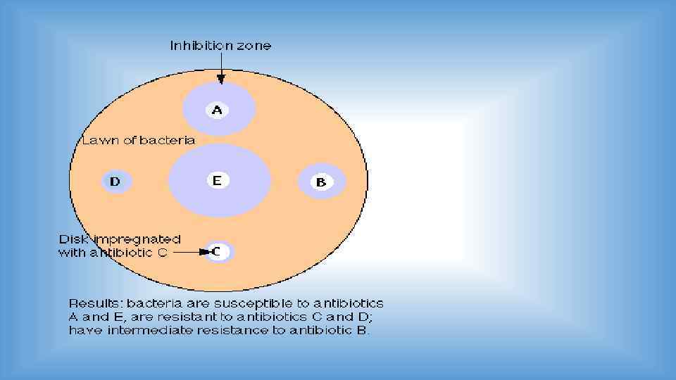 ОПРЕДЕЛЕНИЕ ЧУВСТВИТЕЛЬНОСТИ БАКТЕРИЙ К АНТИБИОТИКАМ МЕТОД ДИСКОВ Бактериальную культуру засевают газоном на питательный агар, после чего на его поверхность пинцетом помещают на равномерном расстоянии друг от друга бумажные диски, содержащие определенные дозы разных антибиотиков. Посевы инкубируют при 37 0 С в течение суток. По диаметру зон задержки роста культуры судят о ее чувствительности к соответствующим антибиотикам. При зоне задержки роста до 15 мм культура расценивается как нечувствительная или низко чувствительная, 15 – 24 мм – средняя чувствительность, 25 мм и более – высокочувствительная. http: //microbiologygpma. narod. ru/sreda. html