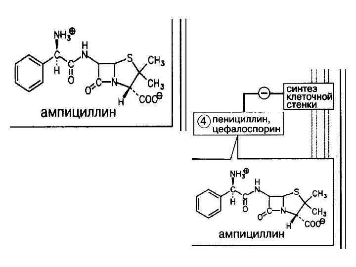 Ампициллиннің синтезі - Микробиологиялық биосинтез әдіспен бензилпенициллинді алады. - Кluyvera citrophila мутанттың ацилазаның әсерімен бензилпенициллинді гидролизға ұшратады (ортаның р. Н 7, 8, 40 -50 о. С). - Ферменттëрге мутантты Pseudomonas melanogenum мен фенилглицинді енгізеді, ортаның жағдайын өзгертеді, р. Н-ың 5, 0 -5, 5 -ке жеткізеді. Бұл ортаның жағдайында екінші микроорганизмнің көмегімен ампициллиннің синтезі жүзеге асады.