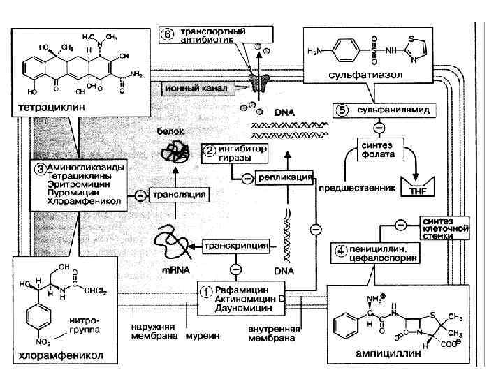 4. Нуклеин қышқылын (ДНҚ және РНҚ синтезін) тежейтін антибиотиктер, неомицин, саркомицин; 5. Пурин мен пириминдердің синтезін тежейтін, антибиотиктер, азосерин; 6. Белоктардың синтезін тежейтін антибиотиктер, бацитрацин, эритромицин; 7. Тынысты (дыхание) тежейтін антибиотиктер, олигомицин, пагулин, антимицин; 8. Тотыға фосфорлану процесті тежейтін антибиотиктер, олигомицин, грамицидиндер; 9. Антиметаболиттік қасиеті бар антибиотиктер, актиномицеттермен саңырауқулақтардың кейбір түрлерімен түзіледі. Антиметаболиттік антибиотиктердің құрылымы табиғи метаболиттердің құрылымына ұқсас келеді де табиғи метаболиттердің алмасуына қатысатын ферменттердің тежегіштері түрінде әсер етеді.