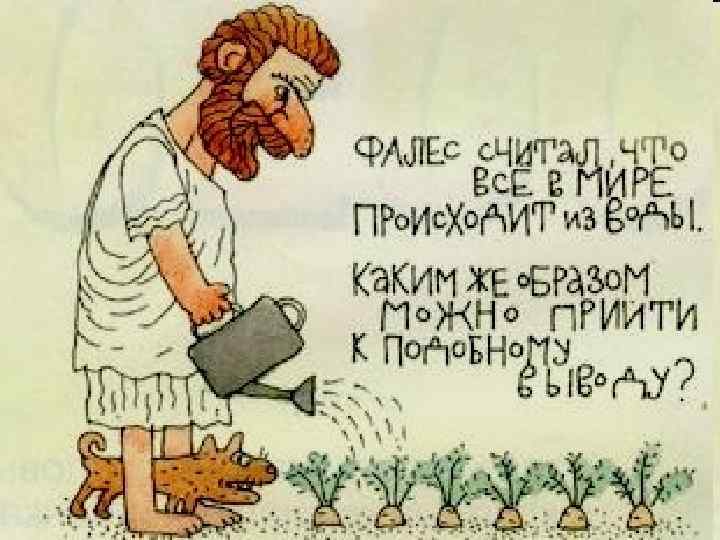 МИЛЕТСКАЯ ШКОЛА (VI в. до н. э. ) Что является началом (архэ) всего? архэ Фалес: архэ – это вода. «Все есть вода» , вода «Все полно богов» Анаксимандр: архе – это апейрон (беспредельное). Из него возникают противоположности (сухое-влажное, холодноегорячее), а из них – четыре стихии – земля, вода, воздух и огонь. Сочетания стихий образуют вещи. Анаксимен: архэ – это воздух. Вещи воздух образуются путем его разрежения и сгущения.