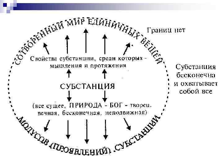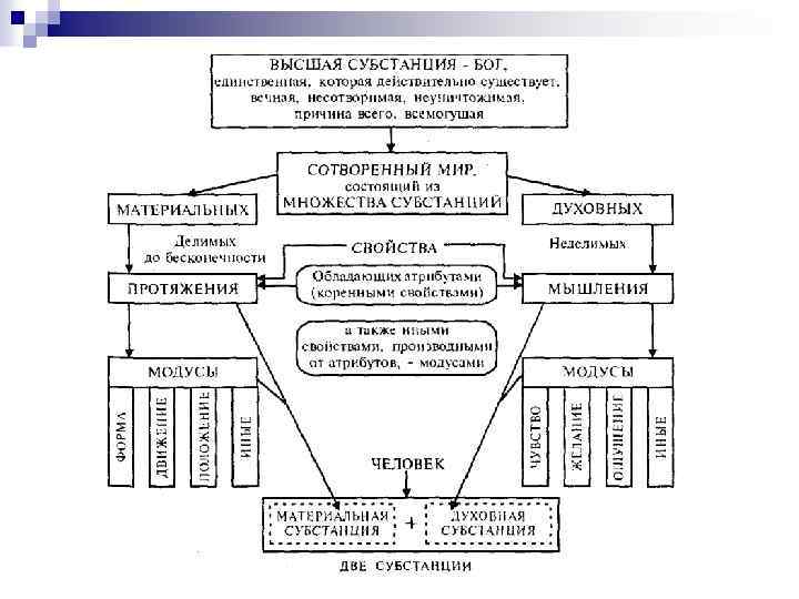 n Фрэнсис Бэкон n Проект преобразования науки. Путь муравья, паука и пчелы: эксперимент, учение об индукции как исследовании форм, табличный характер знания. Разработка индуктивной методологии науки. Тождество знания и могущества. Критика предрассудков как идолов в познании: идолы рода, пещеры, рынка (площади), театра. n n n Рене Декарт n «Мыслю – есмь» (cogito ergo sum) картезианское сомнение МЫСЛЯЩАЯ СУБСТАНЦИЯ. Проблема и правила метода. Учение о врожденных идеях, интуиция и дедукция, ясность как критерий истины. Дуализм (проблема субстанции). См схему далее Свобода воли и проблема источника заблуждений. Материя и движение (механицизм). n n n